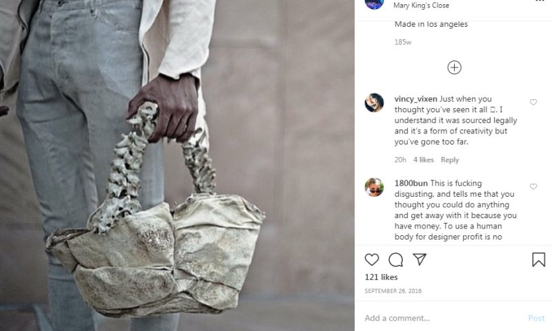 Tulang itu pun disebut merupakan tulang asli dari manusia. Namun dirinya mengklaim tulang tersebut berasal dari surplus medis di kanada. Tas tersebut berbentuk keranjang dengan pegangan yang terbuat dari sumsum tulang belakang manusia. Reaksi keras dan kecaman baru muncul setelah lama gambar itu diunggah.